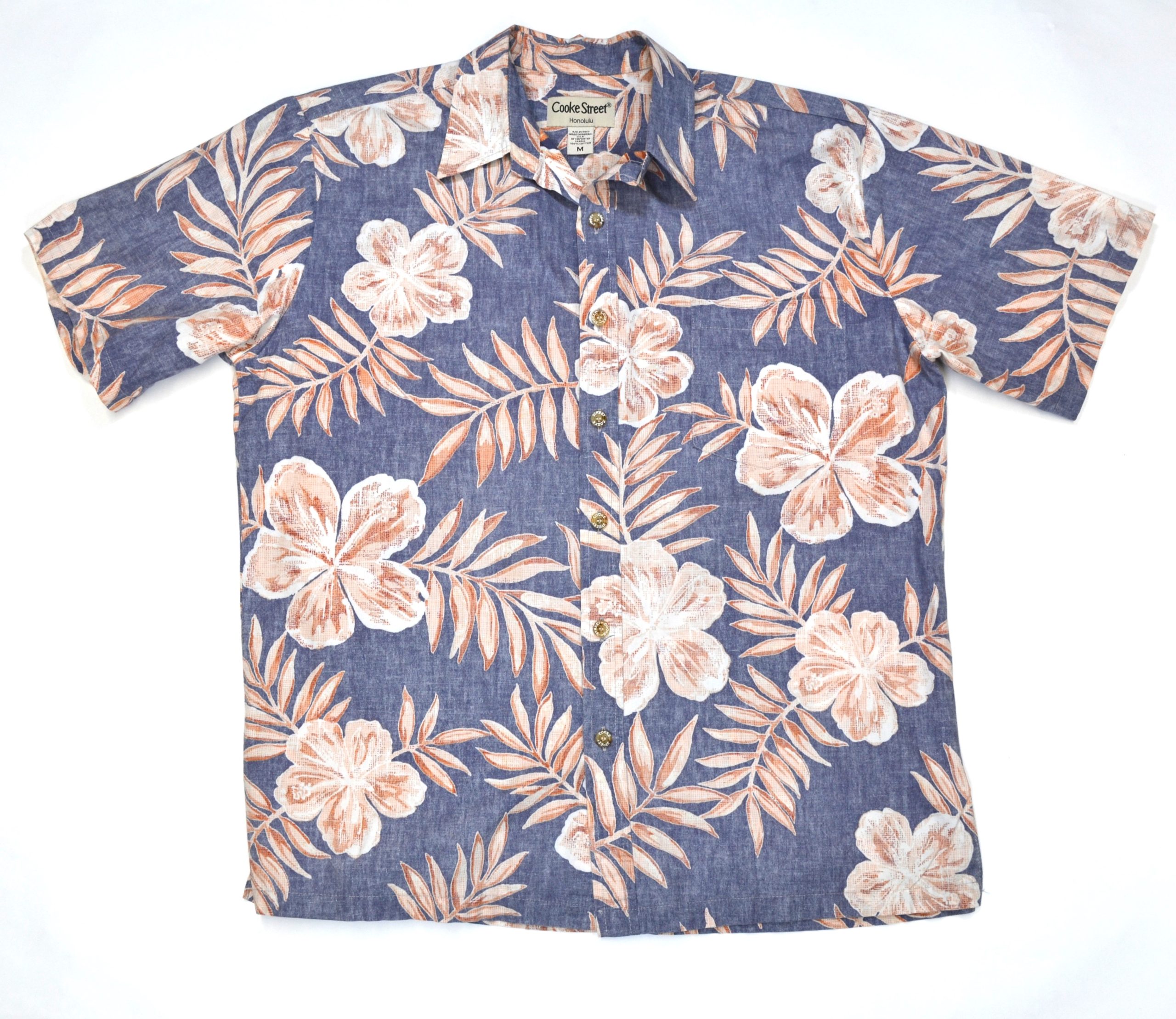 This Cooke Street Hawaiian shirt features a laid-back, vintage-inspired look with its muted blue base and soft peach floral and leaf pattern. The washed-style background gives it a slightly textured, worn-in feel, while the lighter floral tones keep the overall look calm and balanced.