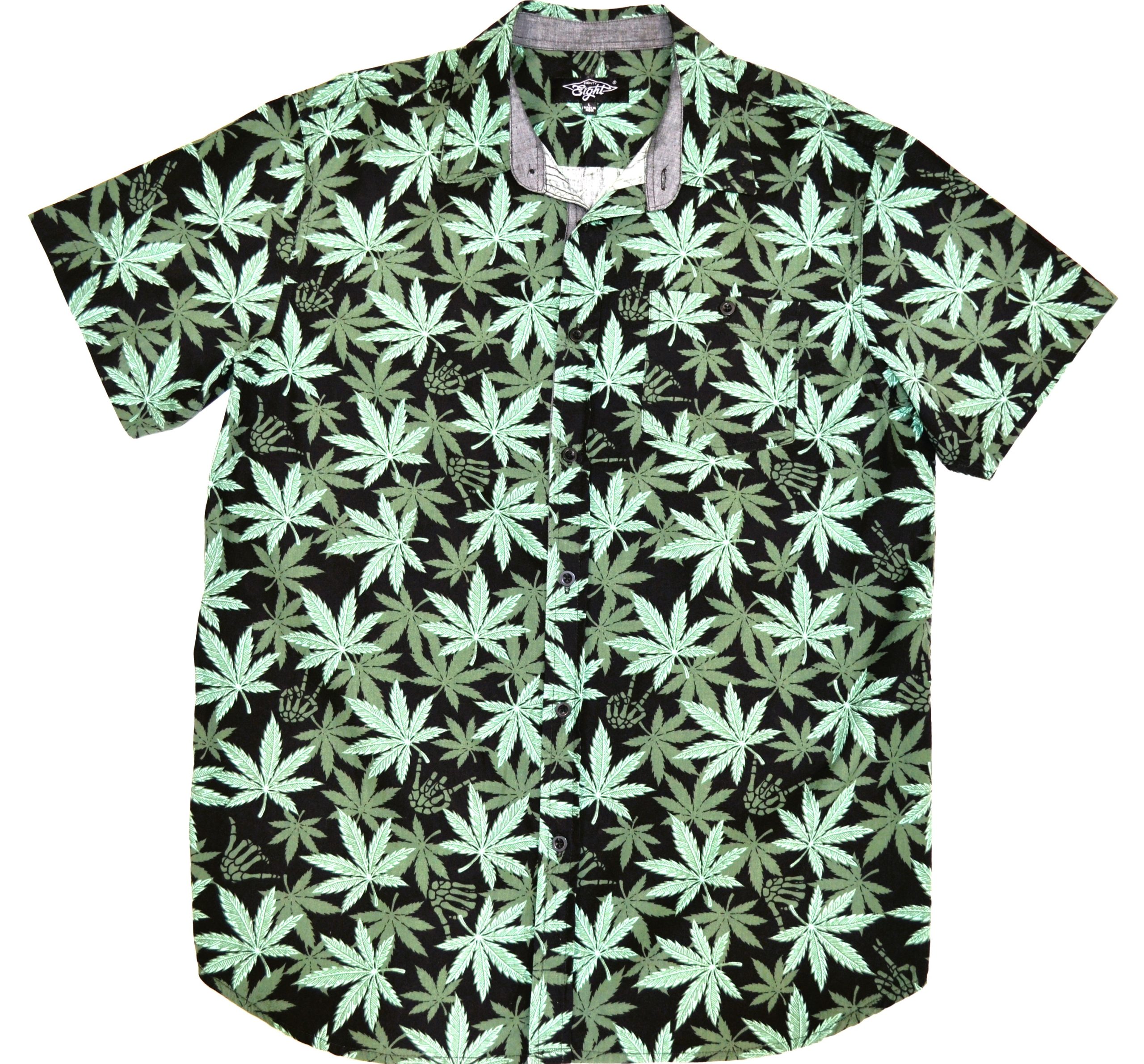 This Eighty Eight Hawaiian-style shirt takes a different direction from traditional island prints, featuring an all-over green cannabis leaf pattern on a deep black background. The design is bold, repetitive, and instantly eye-catching, giving it a more streetwear-inspired vibe while still keeping the relaxed button-up style.