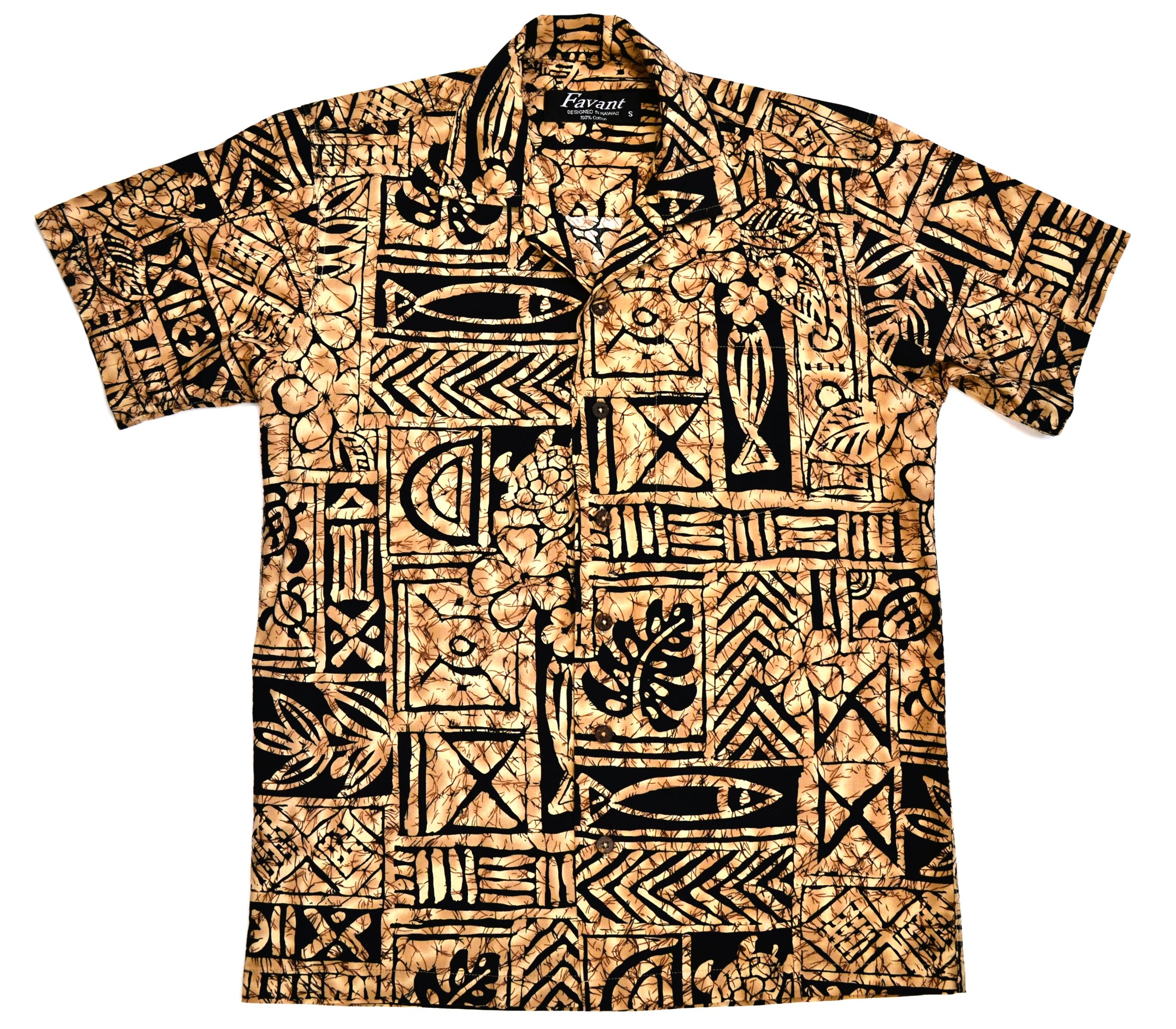 This Favant Hawaiian shirt features a standout tribal tapa-style design with a warm tan base and bold black geometric and island-inspired patterns. The mix of symbols, shapes, and traditional motifs gives it a strong vintage Hawaiian look that sets it apart from standard floral shirts.