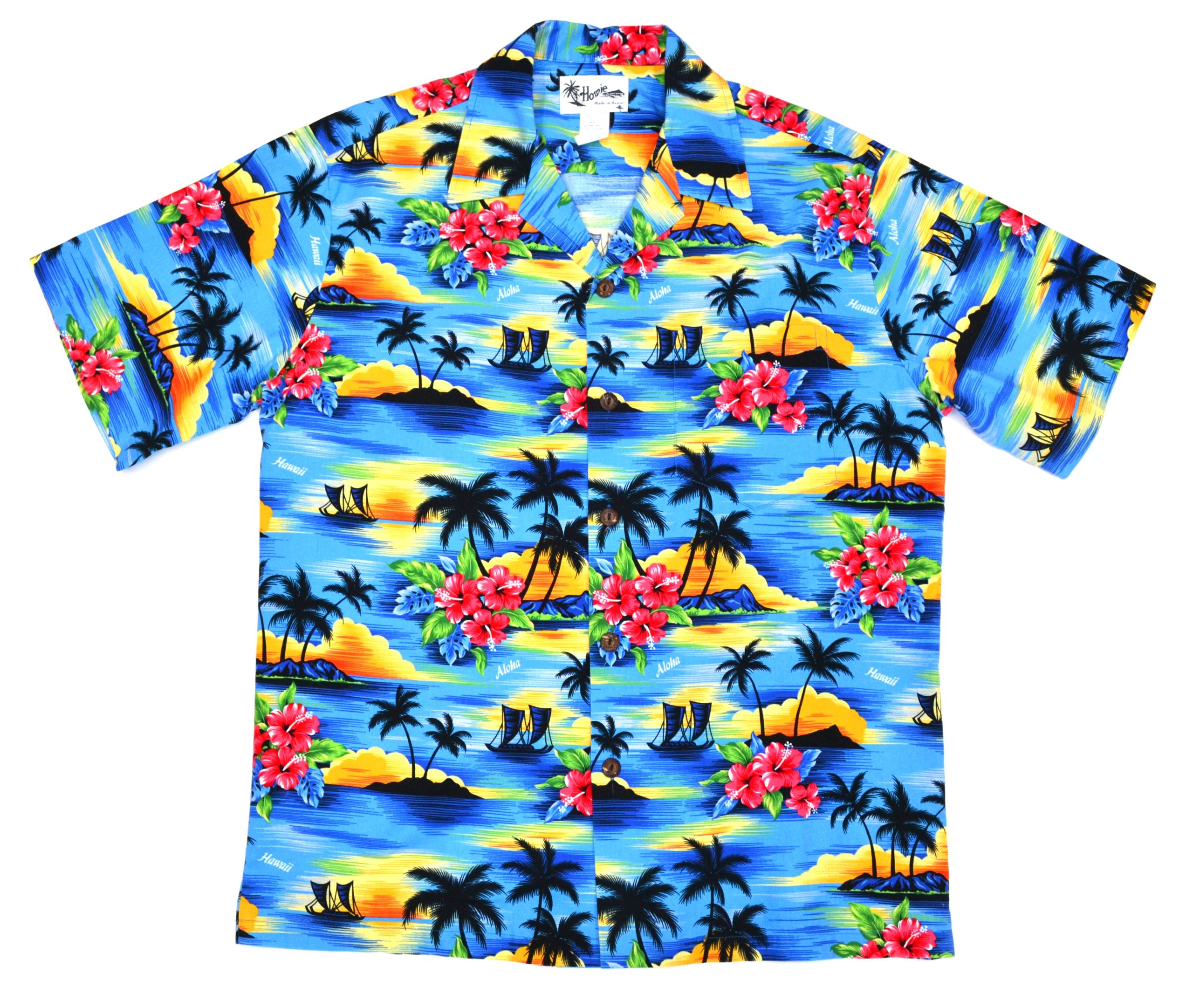 This Hobie Hawaiian shirt delivers a full-on tropical experience with its vibrant blue base and detailed island sunset scene. Featuring palm trees, sailboats, ocean waves, and bright hibiscus flowers, the design captures that classic Hawaiian postcard look.
