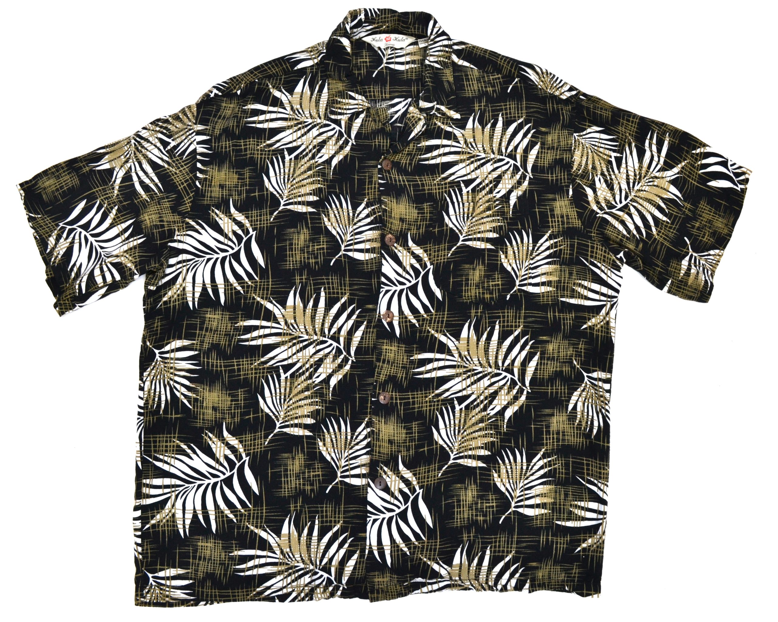 This Kula Kula Hawaiian shirt features a deep black base layered with white and tan palm leaf patterns, creating a sharp, high-contrast tropical look. The subtle textured background adds depth without making the design feel too busy, giving it a more refined edge compared to louder prints.