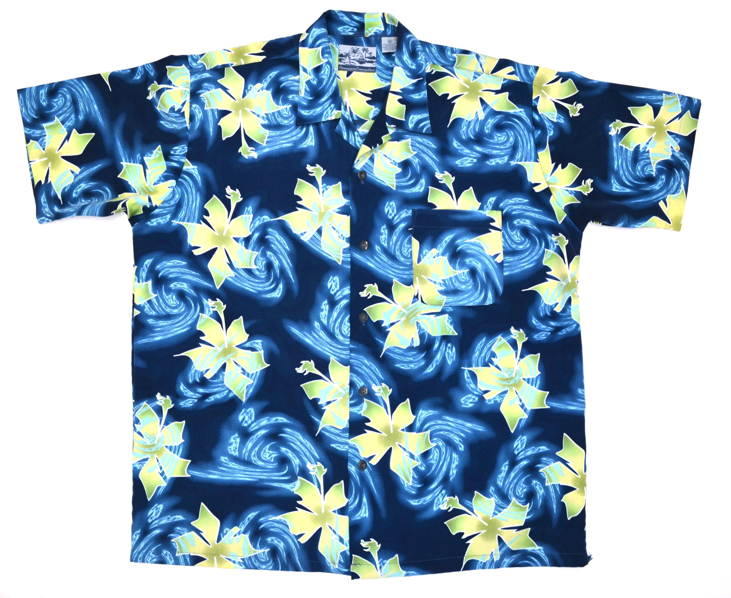 This Pineapple Connection Hawaiian shirt features a deep blue base with flowing wave patterns paired with light green hibiscus flowers, creating a strong ocean-inspired design. The mix of motion from the waves and the bold floral elements gives it a dynamic, standout look without relying on overly bright colors.