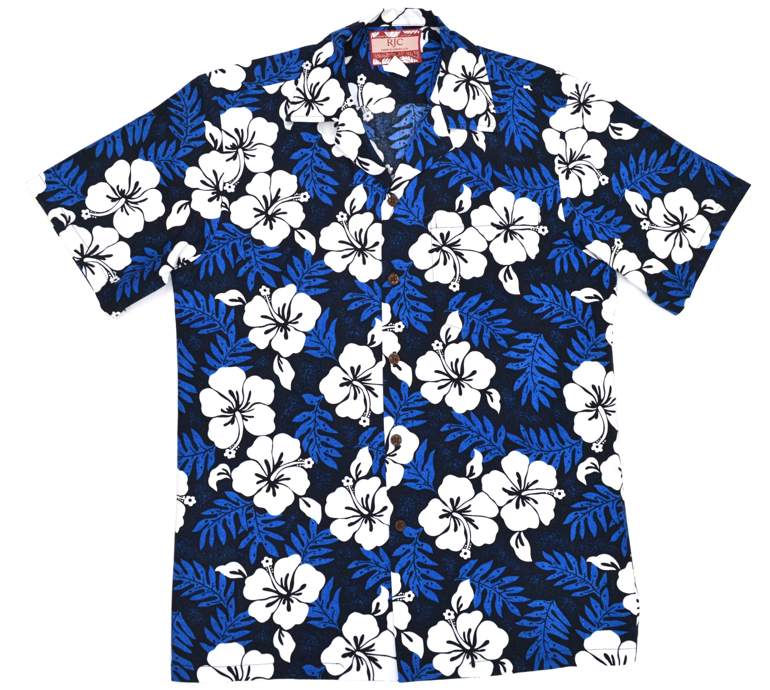 This RJC Hawaiian shirt features a rich deep blue base with large white hibiscus flowers and blue leaf accents, creating a strong, high-contrast tropical look. The classic floral design stands out clearly without feeling overly busy, making it a timeless island-style piece.