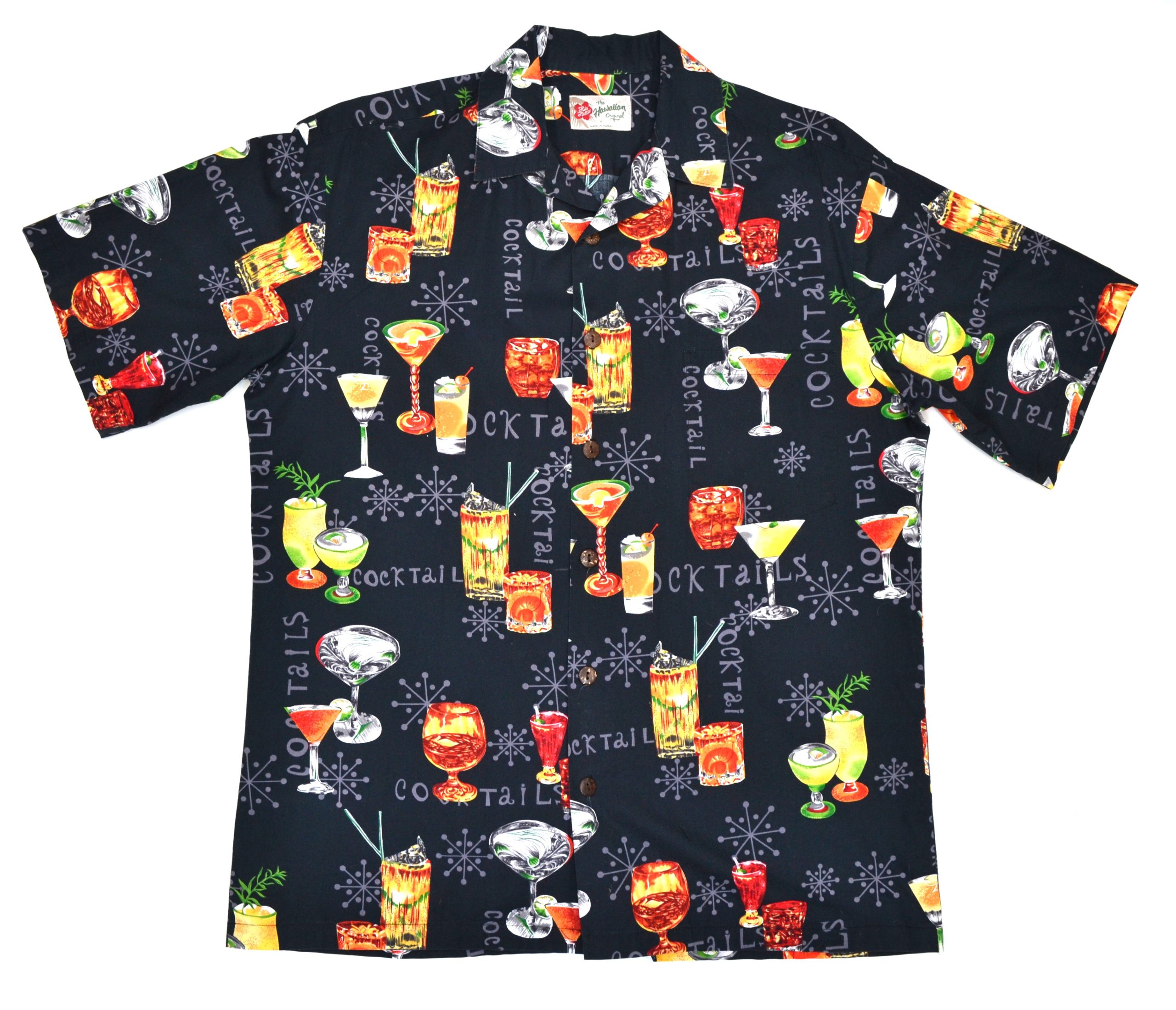 The design includes scattered cocktail glasses in bright reds, greens, yellows, and oranges, along with subtle starburst accents and “cocktails” text throughout, giving it a mid-century lounge aesthetic. It’s a standout piece that leans more toward party and bar vibes rather than traditional floral Hawaiian prints.